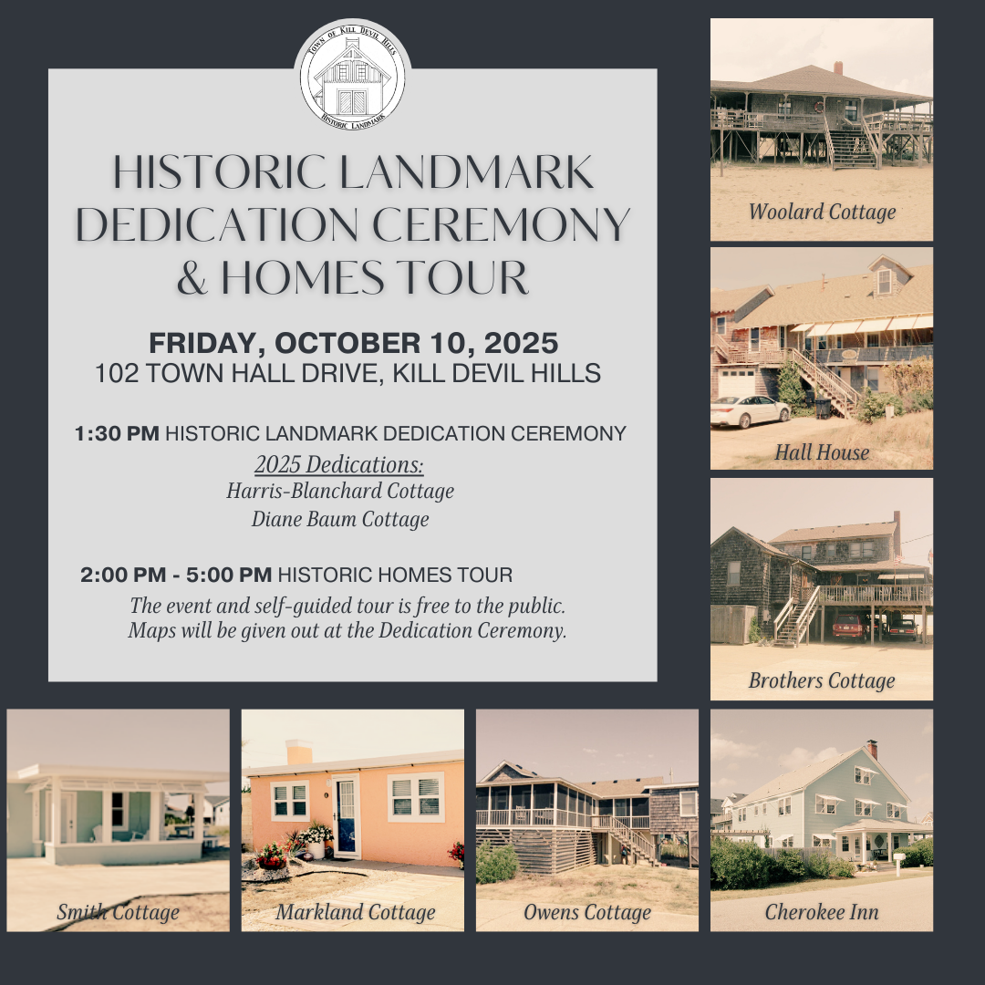 Take a step back in time to the Outer Banks of Yesterday! The Town of Kill Devil Hills Historic Landmarks Commission proudly presents its annual Dedication Ceremony and Homes Tour on Friday, October 10, 2025, and you are invited! 1:30 p.m. - The event begins at KDH Town Hall: A Dedication Ceremony for the newest Historic Landmarks will take place at KDH Town Hall, 102 Town Hall Drive, Kill Devil Hills. A video series highlighting the Town’s historically designated homes, which includes homeowner interviews and interior footage, will be shown. Light refreshments will be served as well. 2:00 p.m. to 5:00 p.m. - The self-guided tour of Historic Designated Homes will take place. A Historic Landmark guide and list of homes participating in the tour can be picked up at 102 Town Hall Drive immediately following the Dedication Ceremony.
